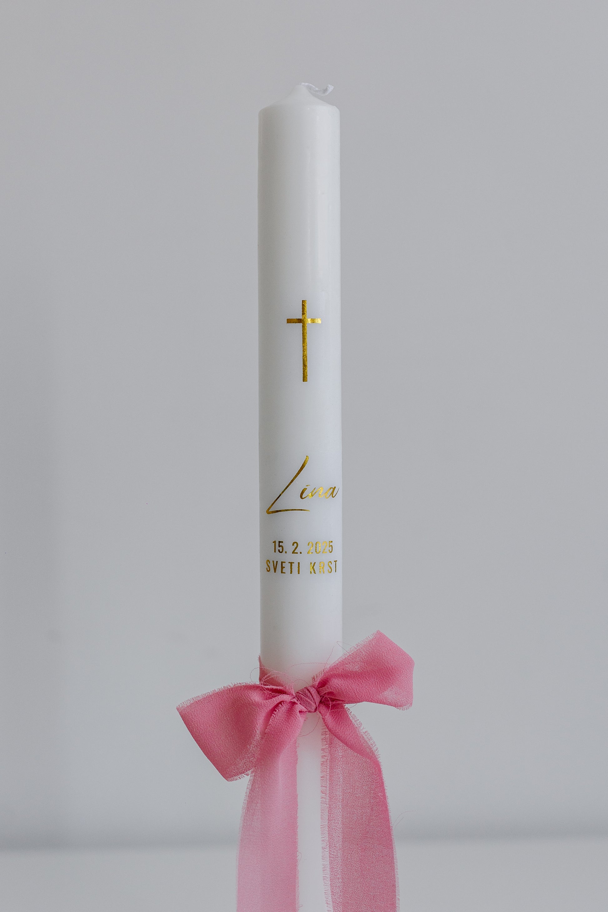 Svaka krsna svijeća je jedinstvena – ručno ukrašena odabranom satenskom vrpcom koja daje dašak elegancije i profinjenosti.