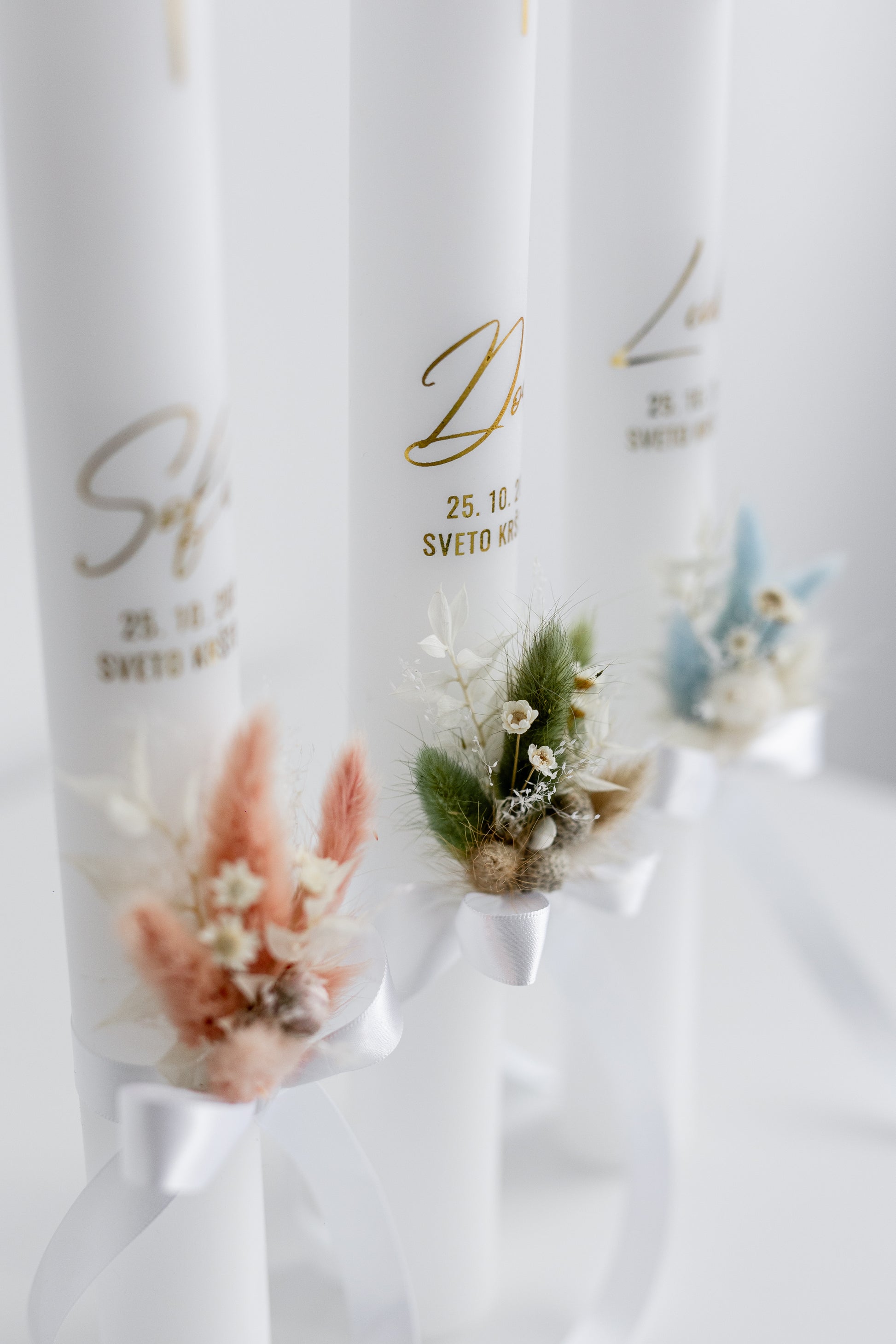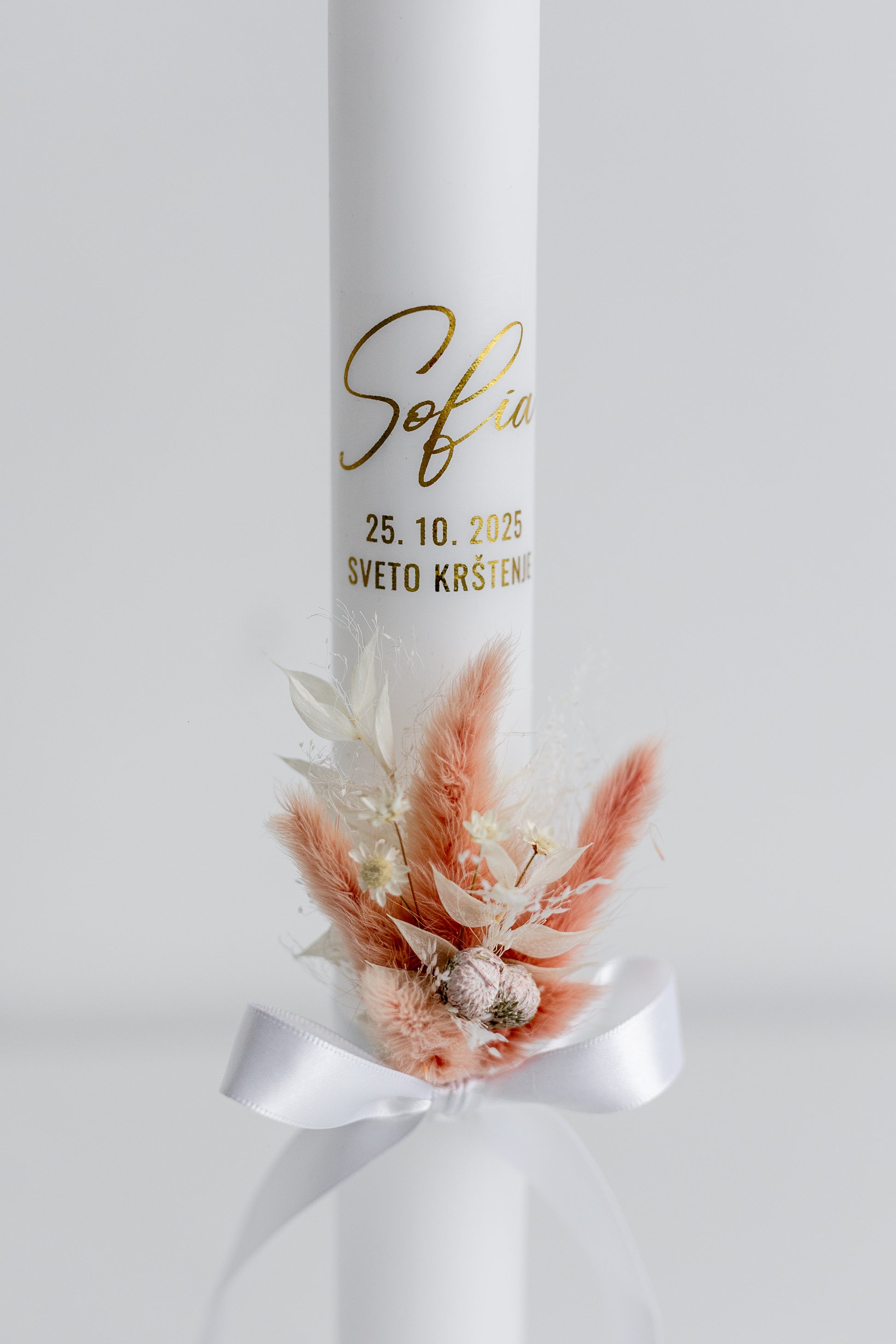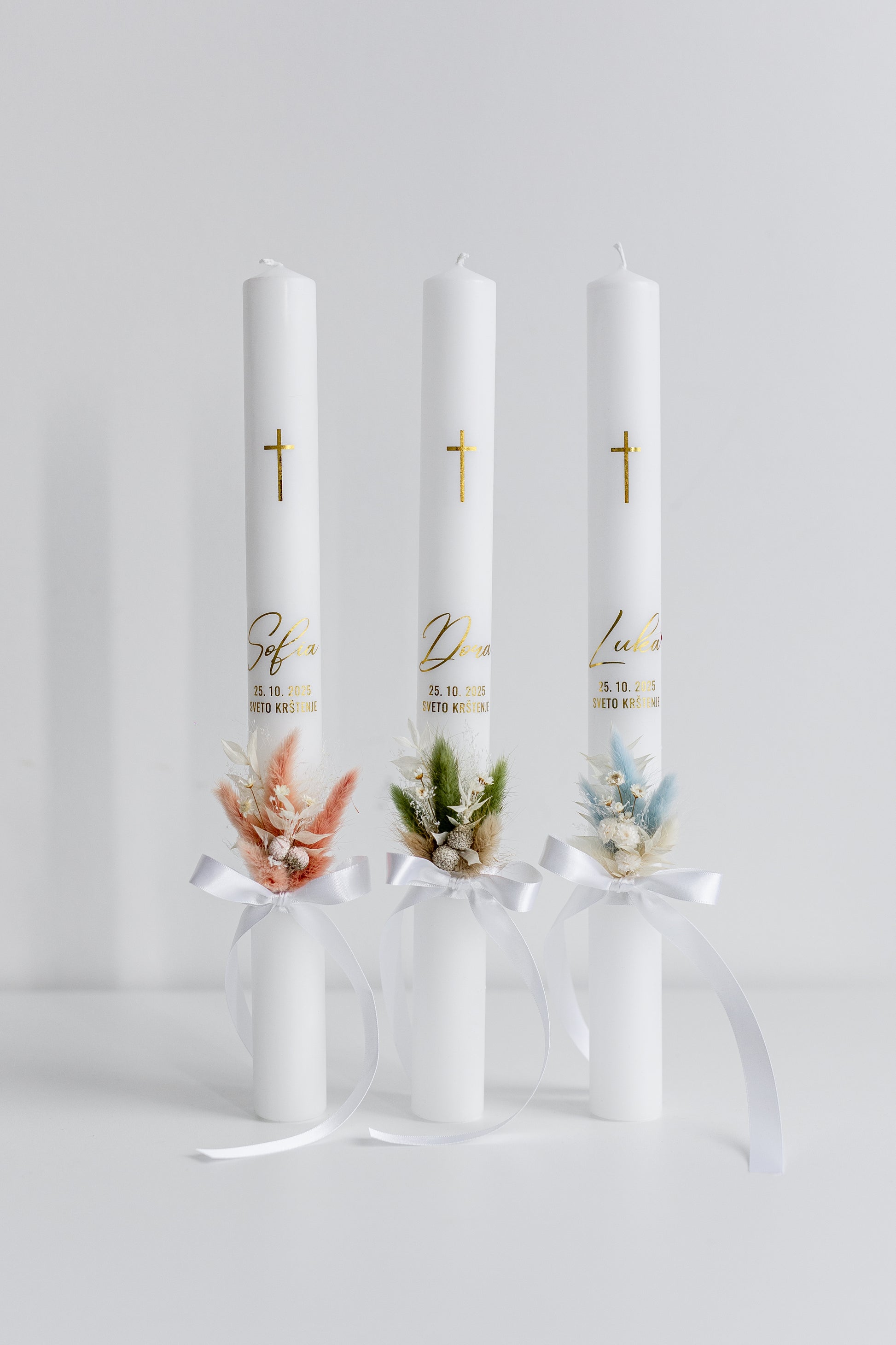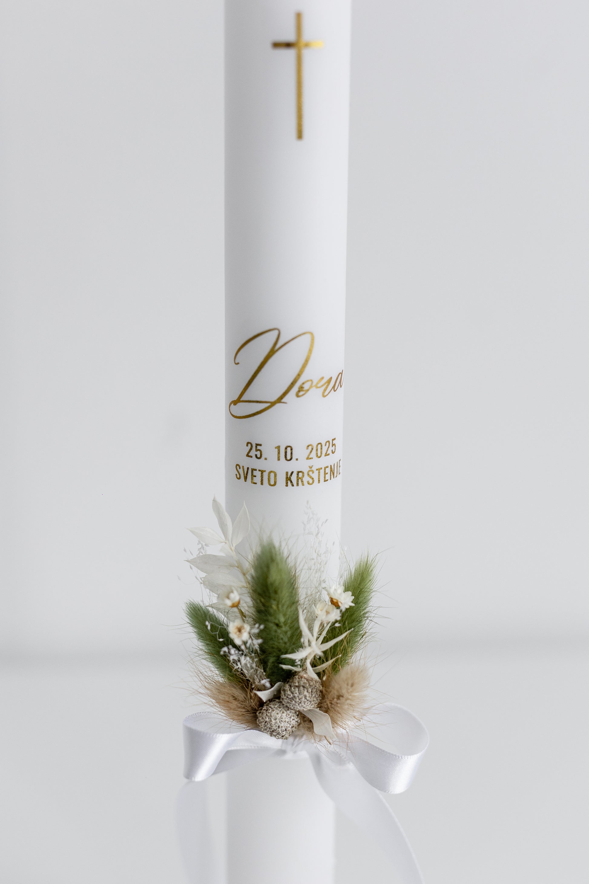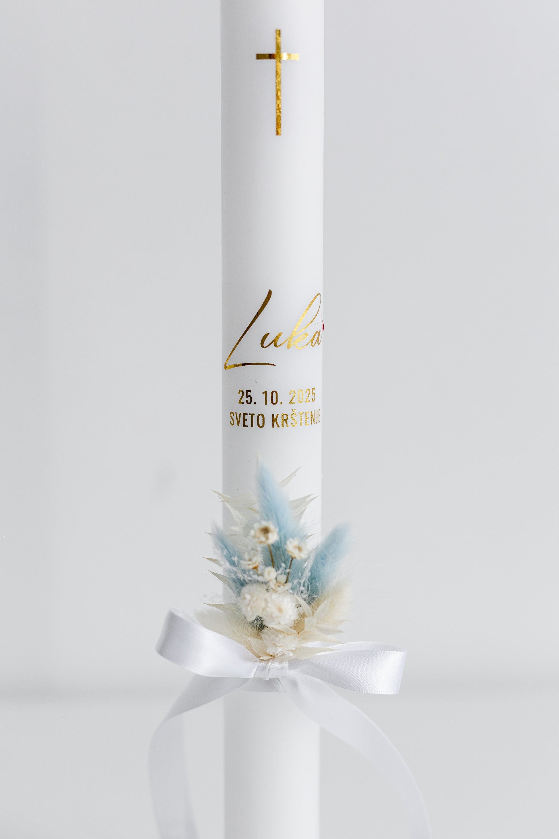 Vsaka krstna sveča je edinstvena, ročno okrašena z izbranim satenastim trakom, ki daje pridih elegance in prefinjenosti. Z ljubeznijo ustvarjena sveča simbolizira čistost, svetlobo in nov začetek ter postane lep spomin na krstni dan.